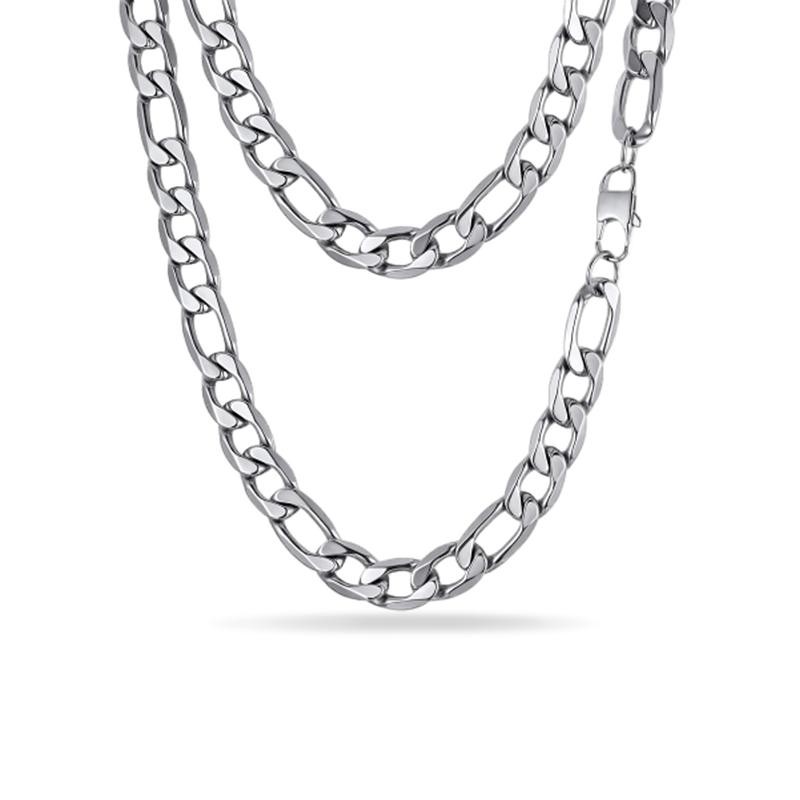 Elevate your look with our stainless steel 3:1 beveled Figaro chain necklace. This classic yet modern accessory combines style and durability, making it the perfect addition to any jewelry collection, suitable for both casual and formal wear.