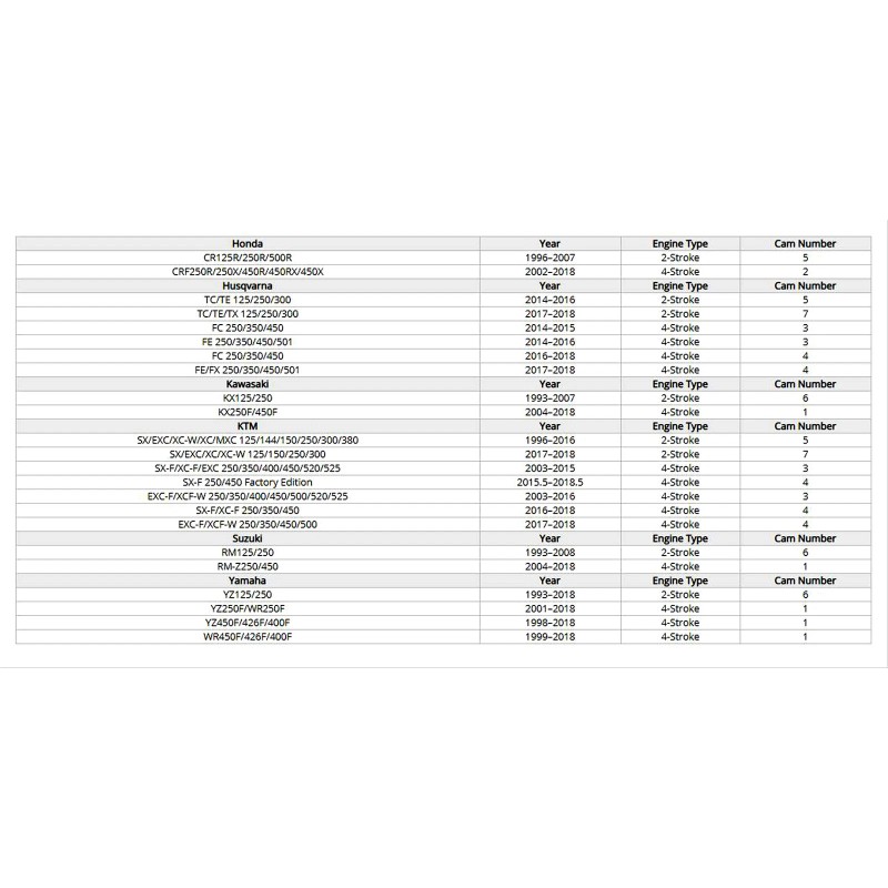 - Includes seven interchangeable throttle cams for most 2-Stroke and 4-Stroke motocross models.