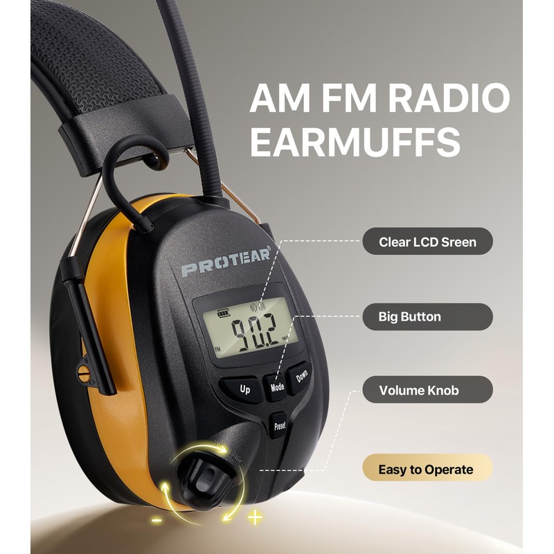 PROTEAR Bluetooth Hearing Protection Headphones with FM AM Radio,25dB NRR Rechargeable Hearing Protectors, Ideal for Lawn Mowing, Construction, Chainsaw, Landscaping(Yellow)