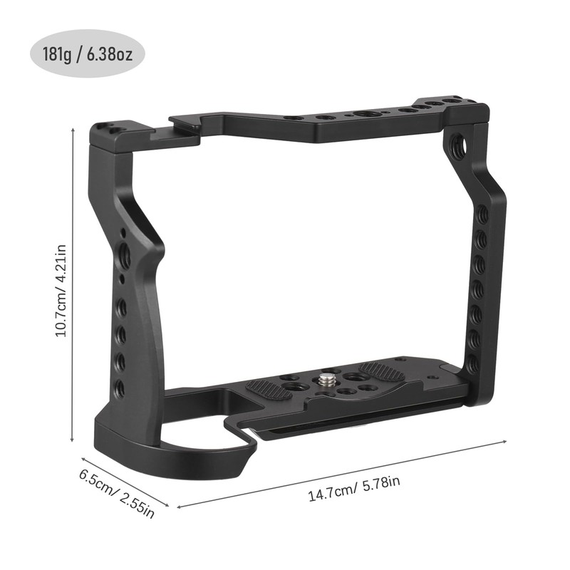 • 【Compact and Easy Carry】This camera cage, with a weight of just 181g and dimensions of 14.7 * 10.7 * 6.5cm, is designed to be light and easy to transport.
