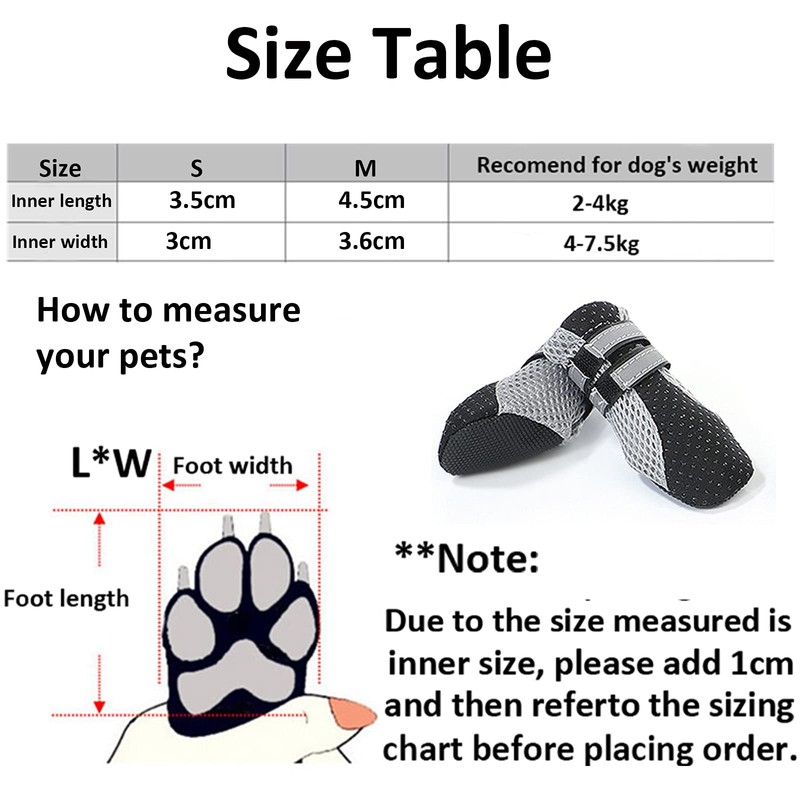 M: Inner Sole Length 4.5cm/1.77inch, Inner Sole Width 3.6cm/1.42inch, recomend for dog's weight from 4-6.5kg