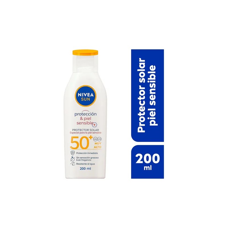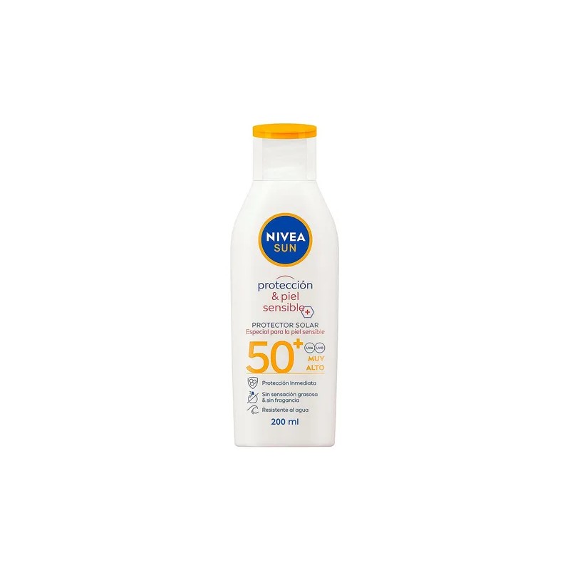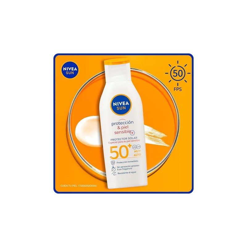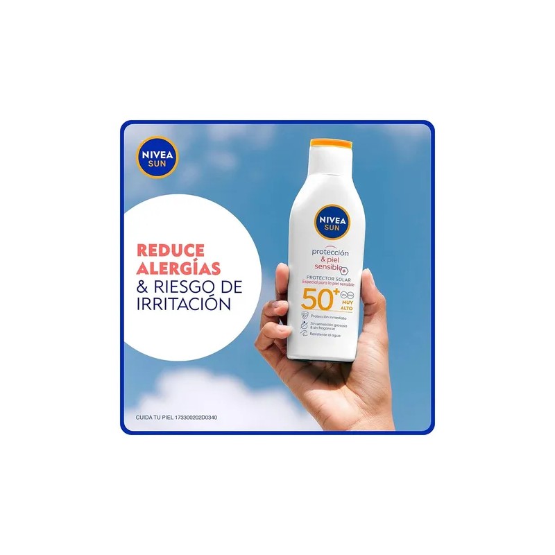 Descripción Limpia: Protege tu piel sensible del sol con el Protector Solar NIVEA SUN Sensitive FPS 50+, especialmente diseñado para minimizar el riesgo de alergias solares. Enriquecido con Vitamina E, este protector solar ayuda a mantener la piel suave y tersa mientras proporciona una protección efectiva contra los daños causados por los rayos UV.