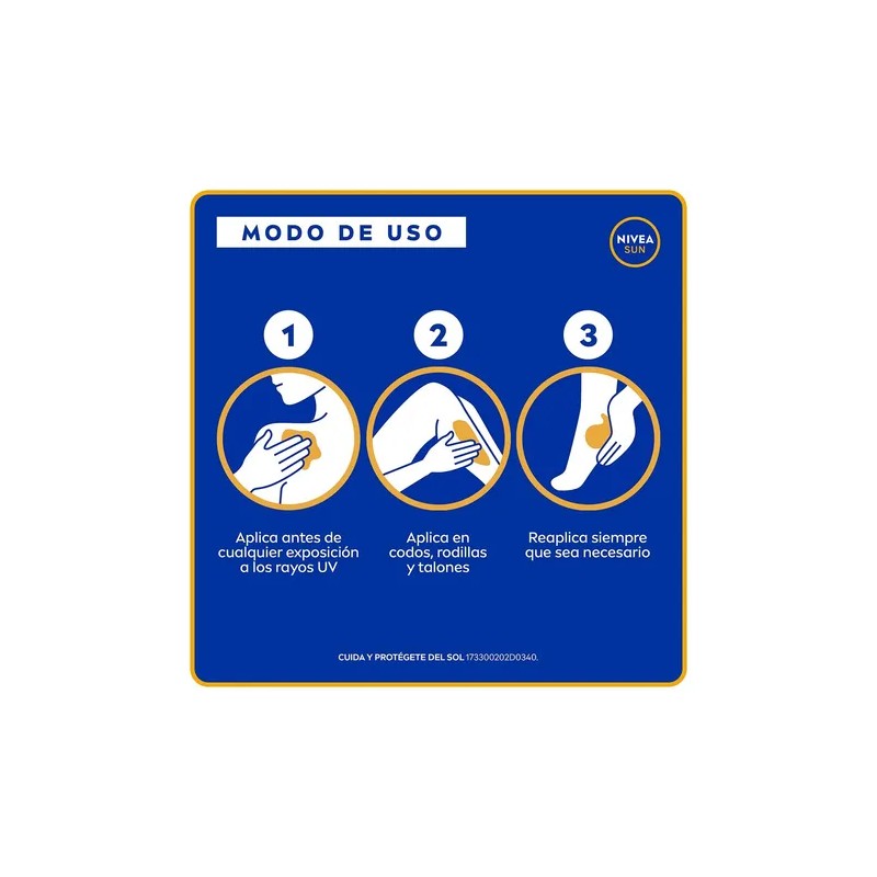 MODO DE USO: Antes de abrir el envase, asegúrate de agitarlo bien. Aplica el protector solar generosamente sobre la piel antes de exponerte al sol, asegurándote de cubrir todas las áreas expuestas. Para mantener la protección, repite la aplicación del producto con frecuencia, especialmente después de nadar, sudar o secarte con una toalla. No olvides aplicar el protector solar incluso en días nublados o con poca exposición al sol, ya que los rayos UV pueden penetrar las nubes. ¡Disfruta tu día, NIVEA SUN protege tu piel!