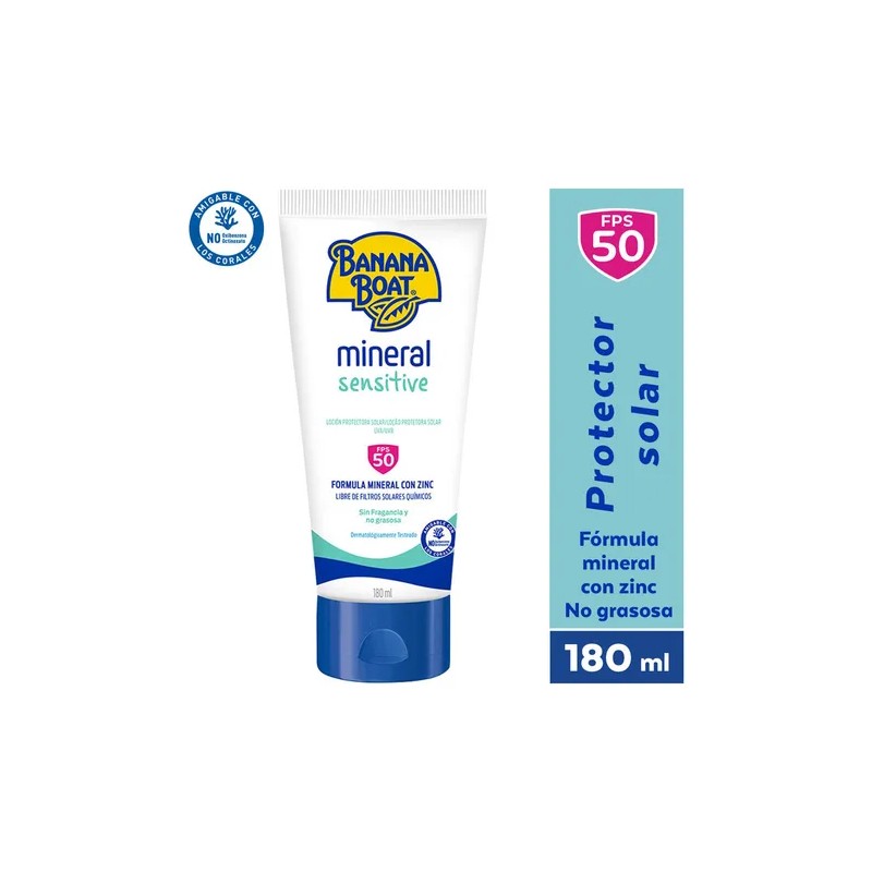 Banana Boat Mineral Sensitive es un protector solar en loción diseñado para aquellas pieles que requieren un cuidado extra. Su fórmula mineral es a base de zinc y óxido de titanio, libre de filtros solares químicos. Testeado por dermatólogos para las pieles sensibles.