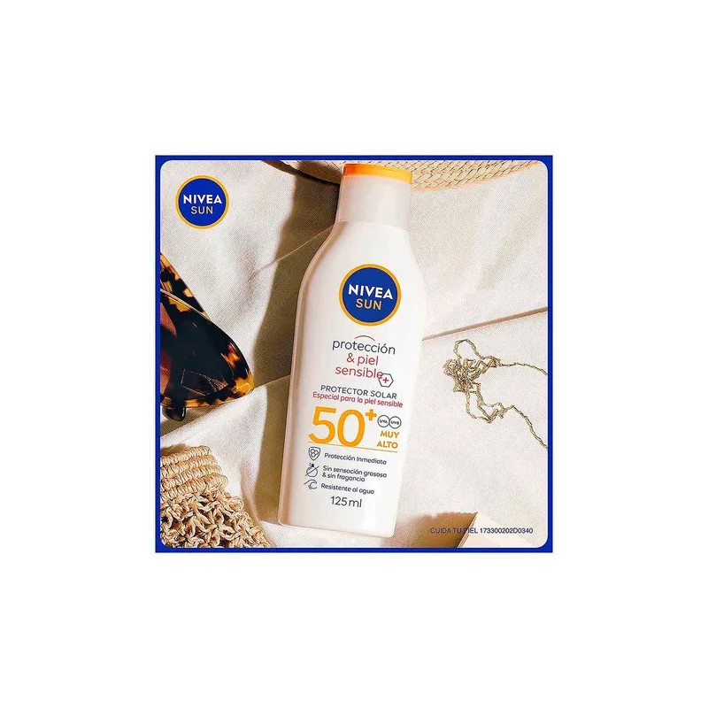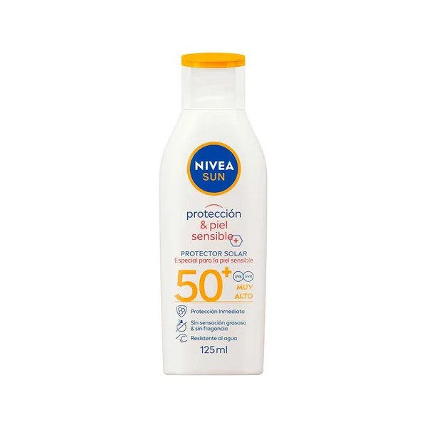 El protector solar de NIVEA SUN para piel sensible con FPS 50+ y su fórmula enriquecida con Vitamina E, ayuda a minimizar el riesgo de alergias causadas por el sol en pieles sensibles, dejando la piel suave y tersa. Efectivo sistema de filtros UVA/UVB que brindan protección inmediata y ayuda a prevenir quemaduras solares y el envejecimiento prematuro de la piel. Resistente al agua. Textura ligera.