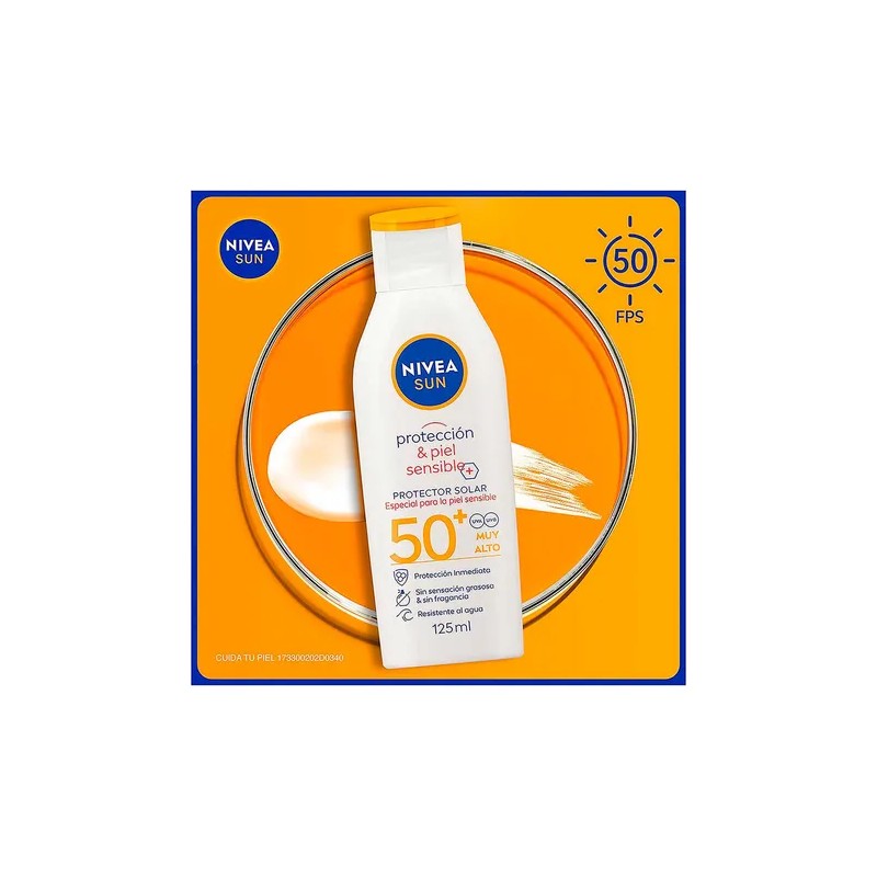 El protector solar de NIVEA SUN para piel sensible con FPS 50+ y su fórmula enriquecida con Vitamina E, ayuda a minimizar el riesgo de alergias causadas por el sol en pieles sensibles, dejando la piel suave y tersa. Efectivo sistema de filtros UVA/UVB que brindan protección inmediata y ayuda a prevenir quemaduras solares y el envejecimiento prematuro de la piel. Resistente al agua. Textura ligera.