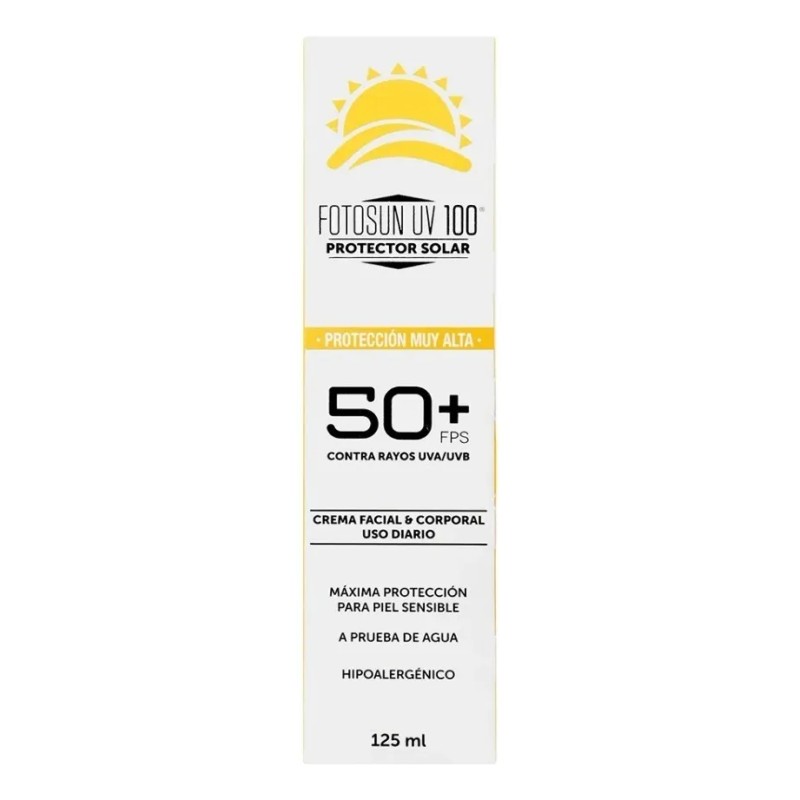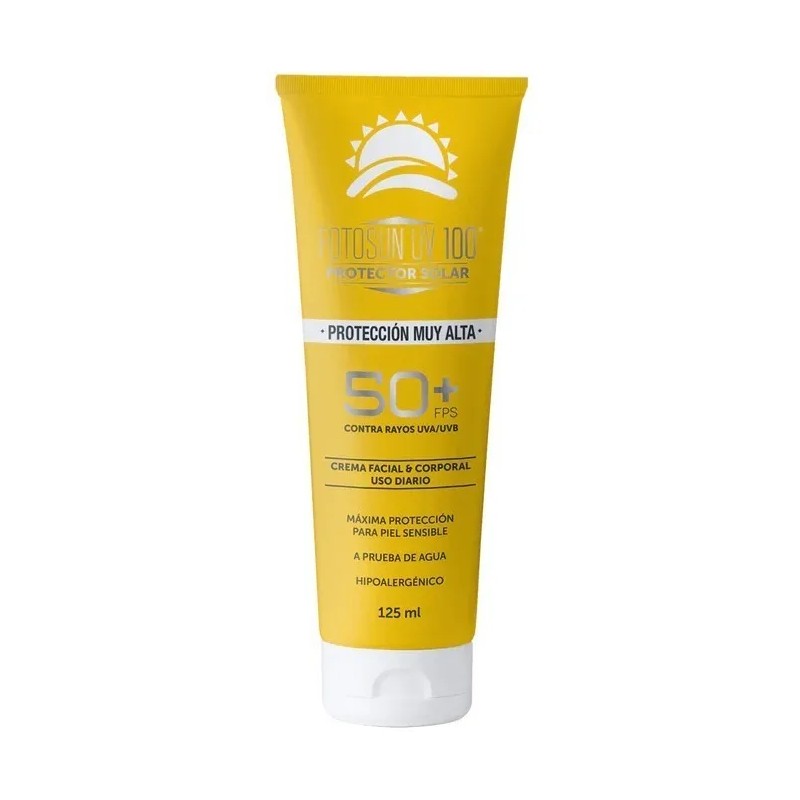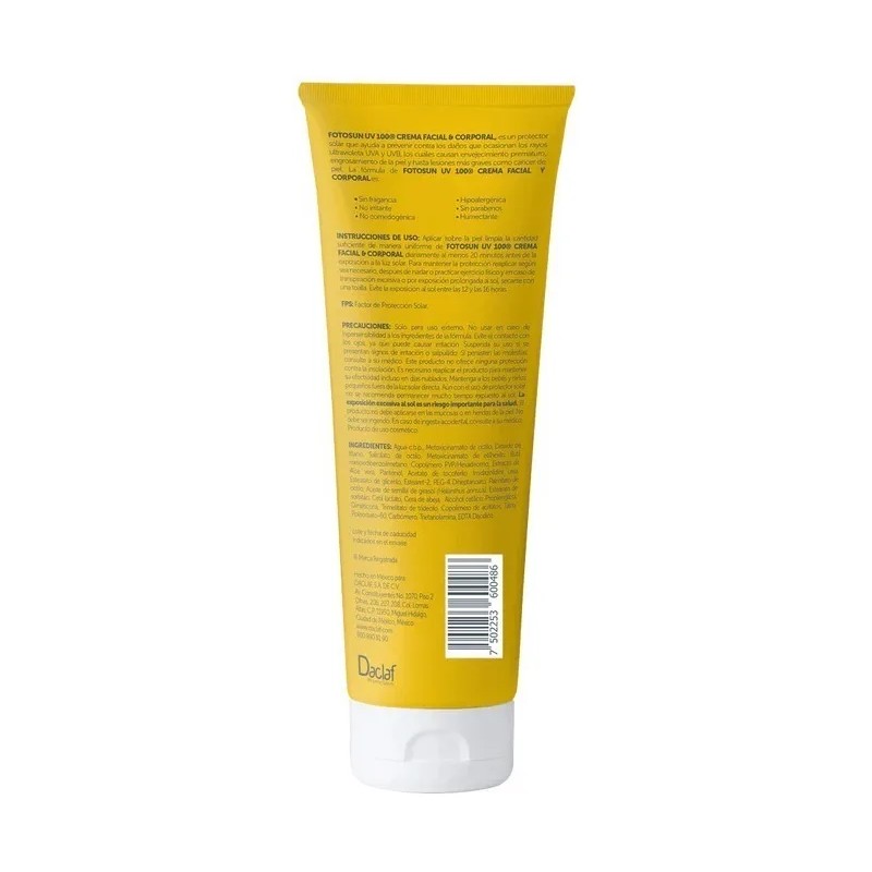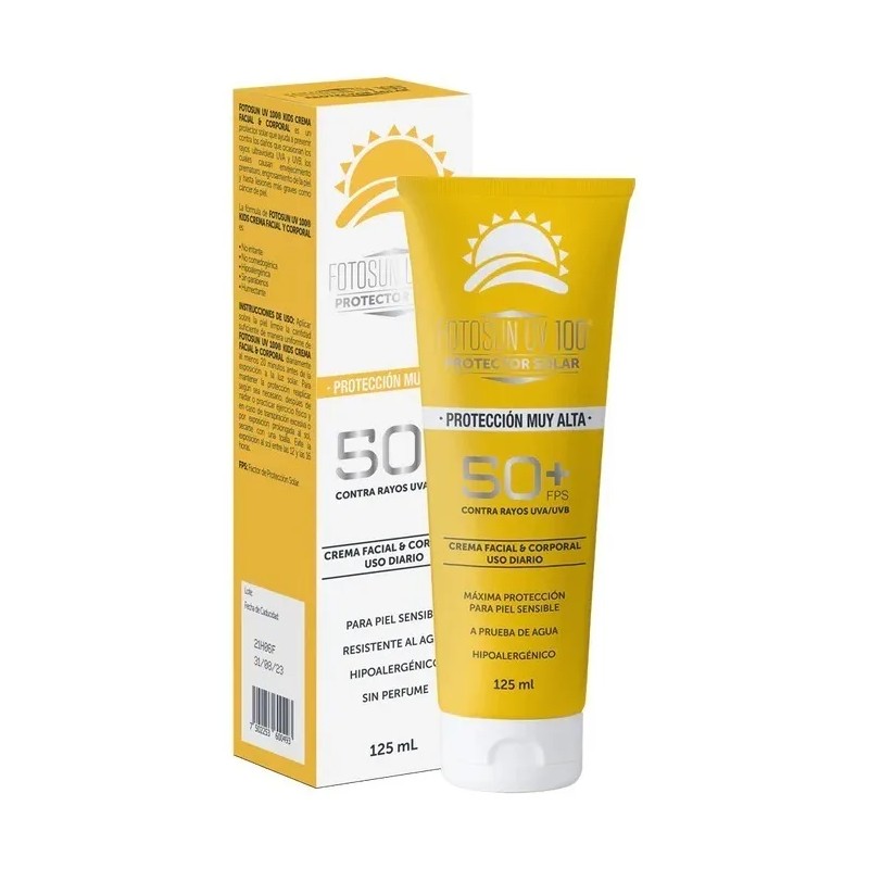 FOTOSUN UV 100® CREMA FACIAL Y CORPORAL, es un protector solar que ayuda a prevenir contra los daños que ocasionan los rayos ultravioleta UVA y UVB, los cuales causan envejecimiento prematuro, engrosamiento de la piel y hasta lesiones más graves como cáncer de piel. La fórmula de FOTOSUN UV 100® CREMA FACIAL Y CORPORAL es: -Protección muy alta FPS 5O+ -Humectante y emoliente -Para todo tipo de piel -Resistente al agua -Hipoalergénica -Sin fragancias -Sin PABA -Sin siliconas -No comodogénica -No irritante