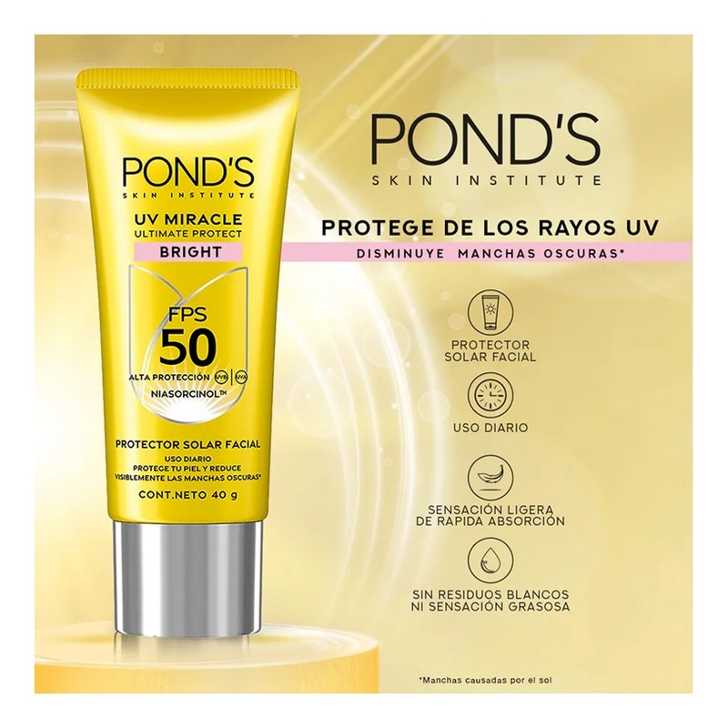 Protege y perfecciona tu piel con el Protector Solar Facial Pond's UV Miracle Bright. ☀️ Su fórmula con FPS 50 y Niasorcinol no solo te defiende del sol, sino que también ayuda a combatir las manchas. ✨