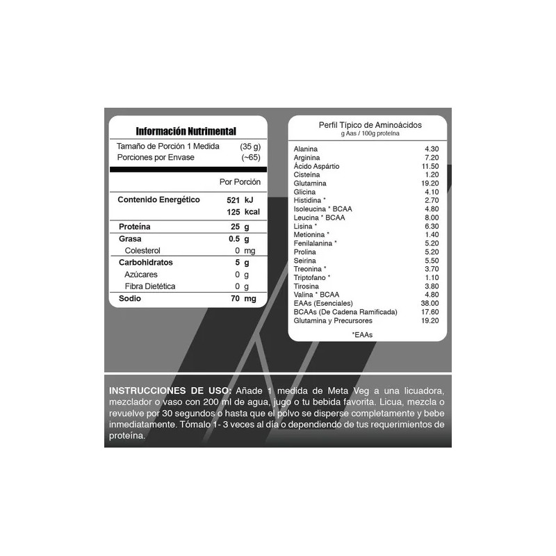 Meta Veg es la deliciosa malteada en polvo diseñada con 25gr. de proteína vegetal aislada e hidrolizada de soya, la cual puede ayudar a reducir la pérdida de nitrógeno y mantenerte en un balance positivo para facilitar el crecimiento muscular y evitar el catabolismo.