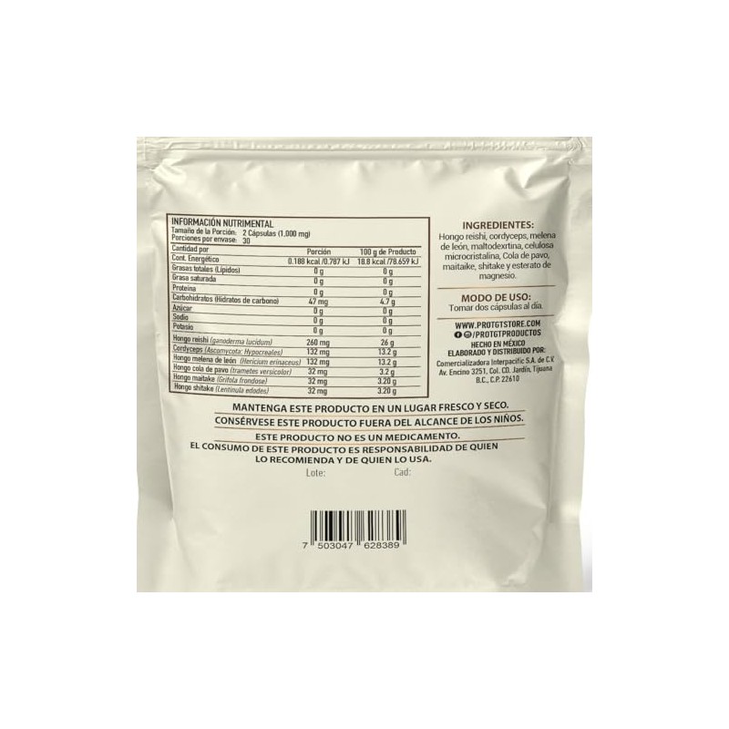 PROTGT | Mushroom Blend en Cápsulas | Mezcla de 6 Hongos Funcionales: Reishi, Cordyceps, Melena de León, Cola de Pavo, Maitake y Shiitake | Suplemento Dietético en Cápsulas Veganas