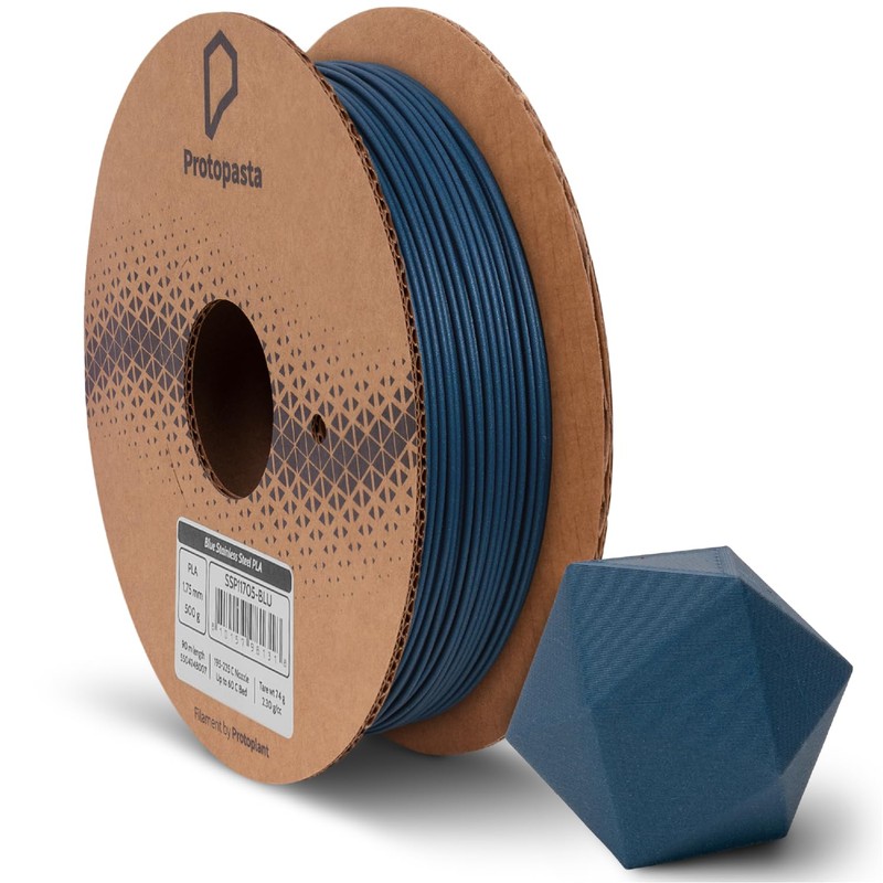 - Metal Infused Filament: Protopasta Metal Filled PLA 3D Printer Filament is comprised of a base Blue Color PLA plastic mixed with 60% by weight stainless steel powder. This 1kg spool of 1.75mm metallic composite filament has twice the density of standard PLA filament, making it perfect for prints requiring a metal look and feel.