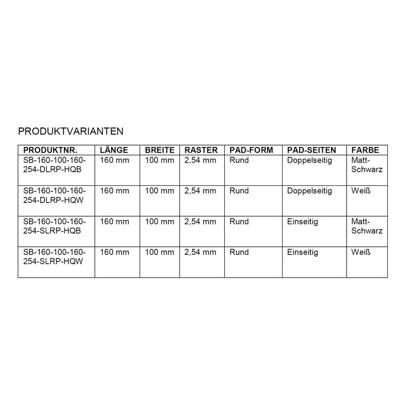 • Length: 160 mm; Width: 100 mm; Colour: Black; Grid: 2.54 mm; Pad Sides: Single Side; Pad Shape: Round; Pad Quantity: 2,148 Pads | 1 x (60 x 36 - 4 x 3); Surface: ENIG-RoHS; … See product description.