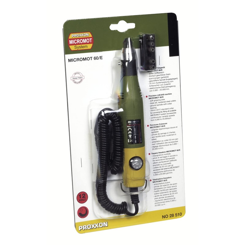 - PROXXON 28510 MICROMOT 50/E 12 Voltage - with a diameter of only 35mm it is unsurpassed easy to manage - the weight of only approx. 230g, the effortless drive via balanced motor with ground spindle and collar bearing allows for quiet run with a pleasing sound to the ear. The size of the machine dictates a 12V drive system, use of a mains adapter of at least 1.0A is thus required.
