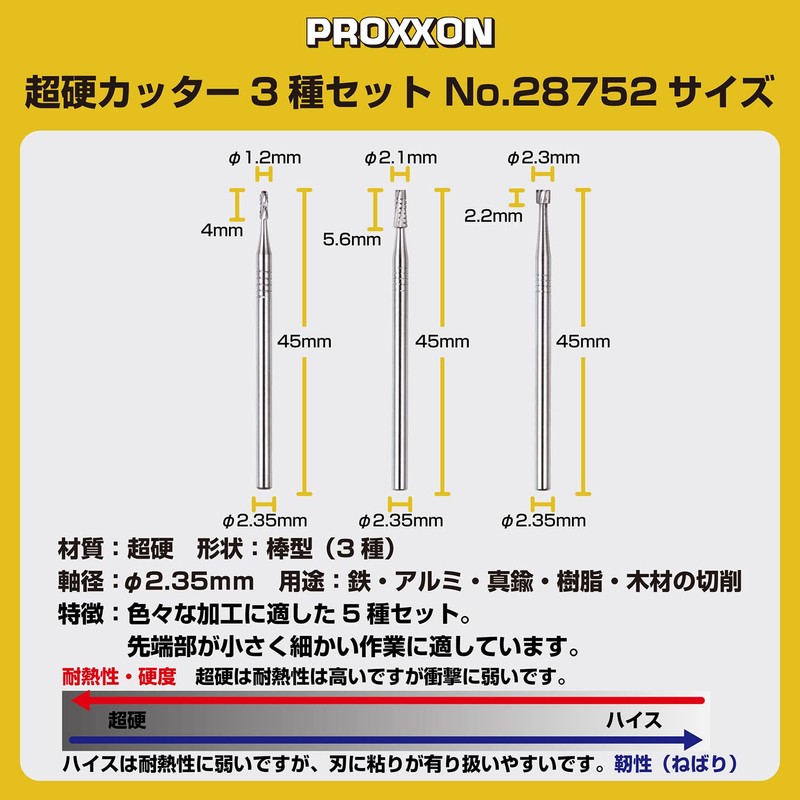 PROXXON No. 28752 Carbide Cutter Set of 3 Types [Bar Type 0.05 inch (1.2 mm), Trapezoid Type 0.08 inch (2.1 mm), 0.09 inch (2.35 mm) Shaft Diameter