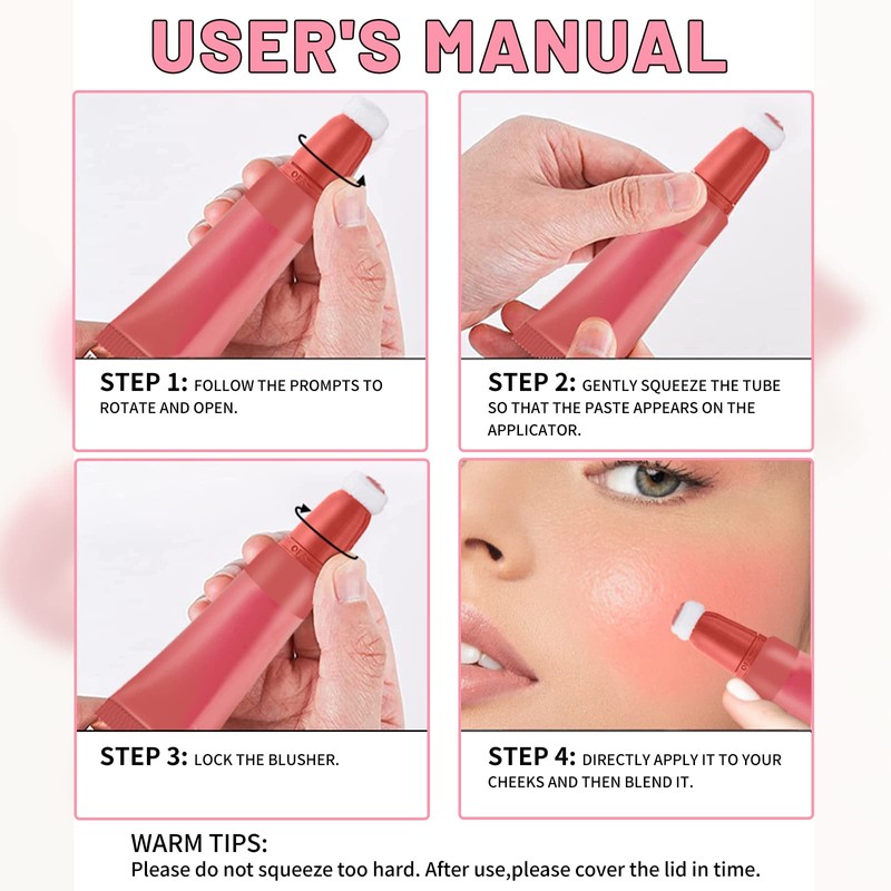3. Instructions for use: follow the prompts to rotate and open, then gently squeeze the tube so that the paste appears on the applicator, lock the blusher and last you can directly apply it to your cheeks.