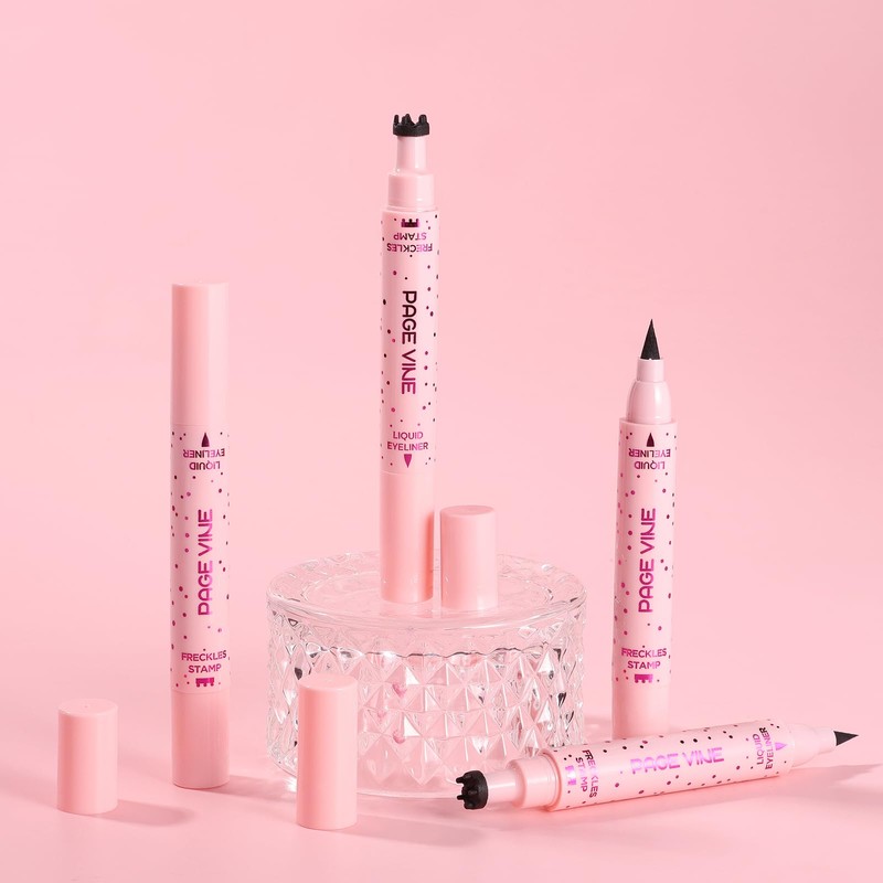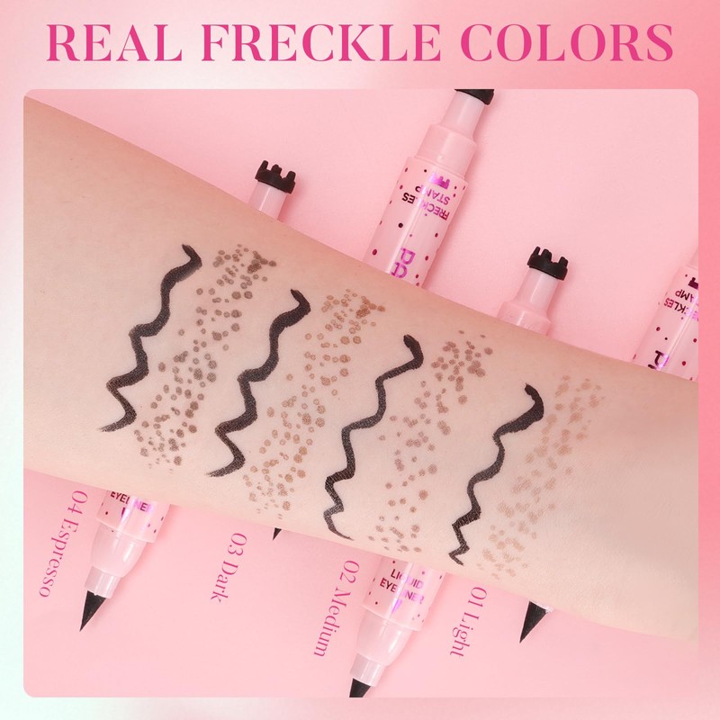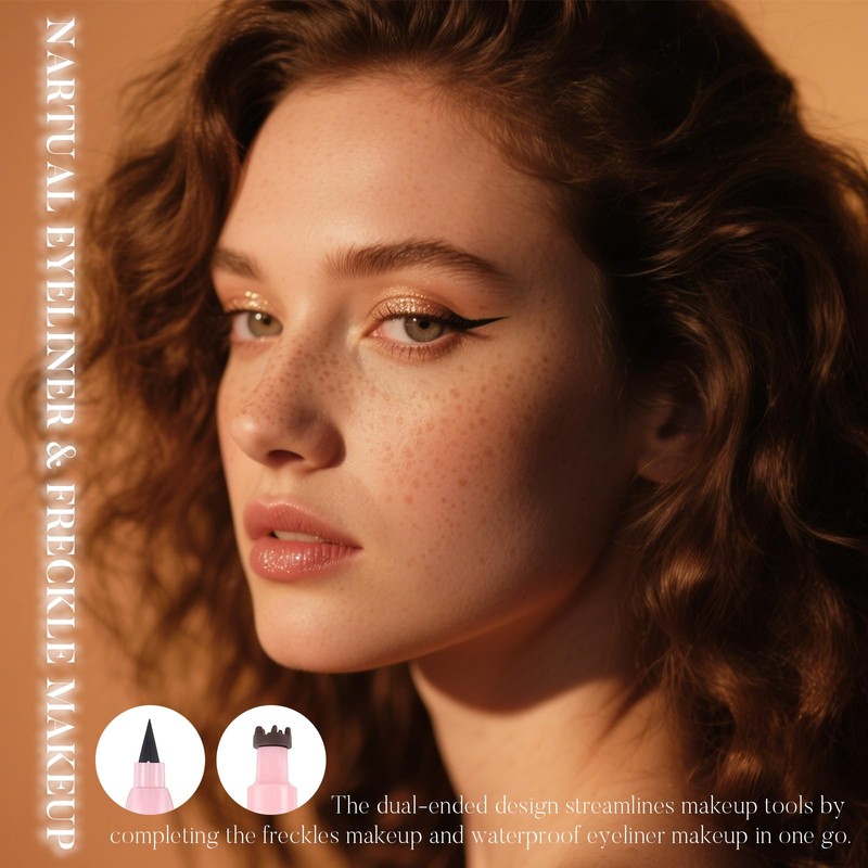 - 2 IN 1 EYELINER AND FRECKLE PEN:This unique makeup pen design features a black eyeliner on one end and a freckle stamp on the other. The dual-ended design streamlines makeup tools by completing the freckles makeup and waterproof eyeliner look in one go.