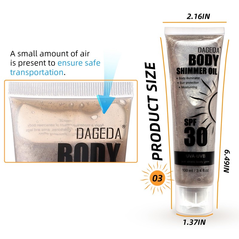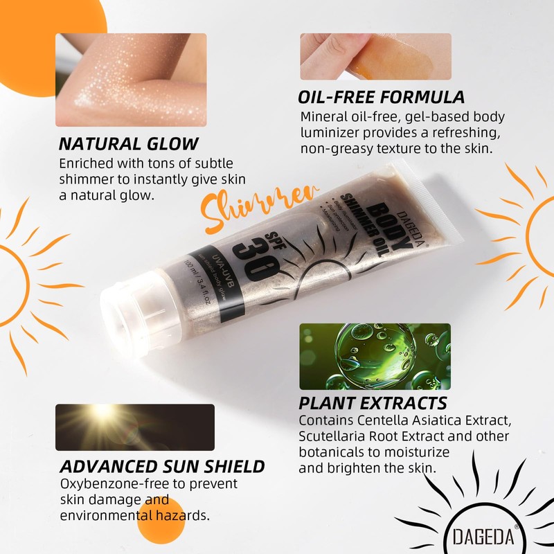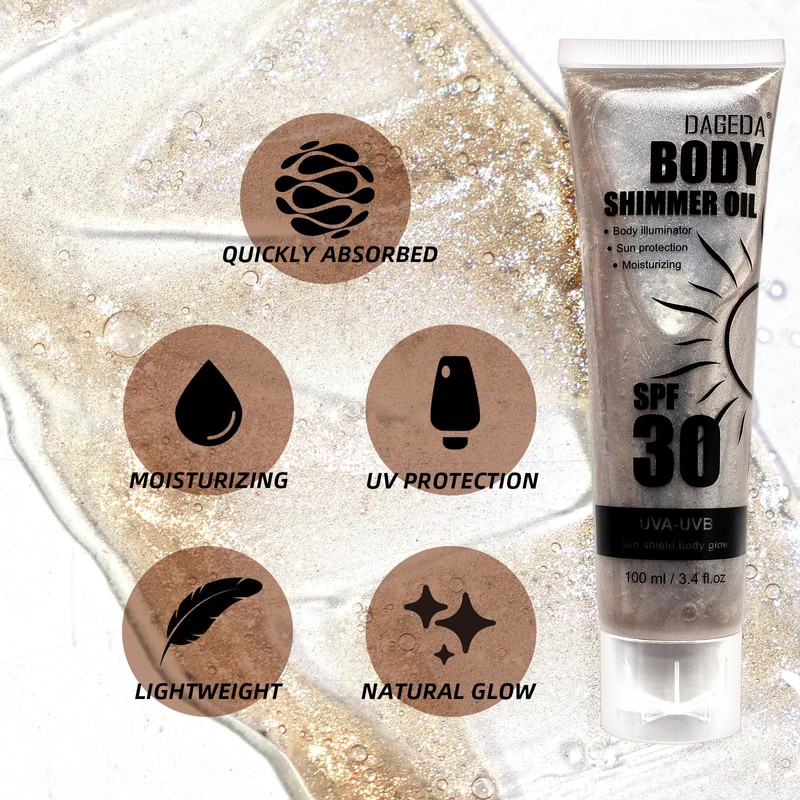 - BODY GLOW: Shimmer Body Oil creates the perfect combination of moisturizing, shimmering, and sun protection for a natural, sun-kissed glow. This glitter sunscreen is a must-have accessory for all your sunny adventures at the beach, summer festivals and music parties.