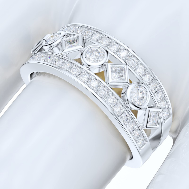 - Design: This ring measures 8mm (0.32inches) in width. And it is 2.1mm high from the top to the inside of the ring. The band thickness is 1.4mm (height from finger), certainly durable for long-lasting wear. It is also accented with about 43 detailed side stones, making the ring much more brilliant.