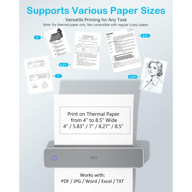- ✅【Portable Thermal Printer – Compact & Travel-Friendly】Only 10.5" x 2.2" x 1.6" and weighs just 1.1lb, the PRT610 portable thermal printer fits easily in your bag, backpack, or briefcase. Uses no ink, toner, or ribbons—just thermal paper. A perfect inkless portable printer for travel, remote work, business, car, student or home use.