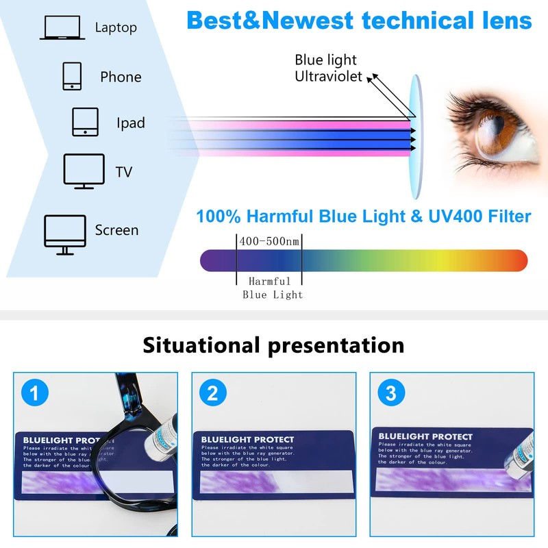 • Blue Light Filter Reading Glasses: Blue light lens provide all day protection against blue ray radiation and UV400, alleviates visual fatigue and discomfort from browsing mobile phones, tablets, gaming and working under fluorescent lights.