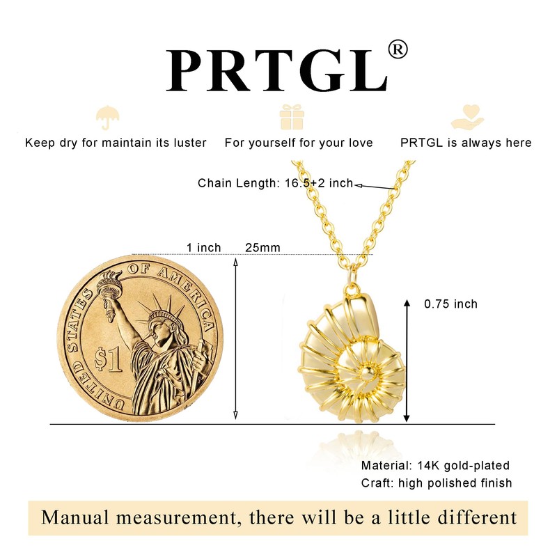 PRTGL Beach Necklace: 14k Gold Plated Big Nautilus Conch Shell Beach Necklace for Women 16.5”+2”