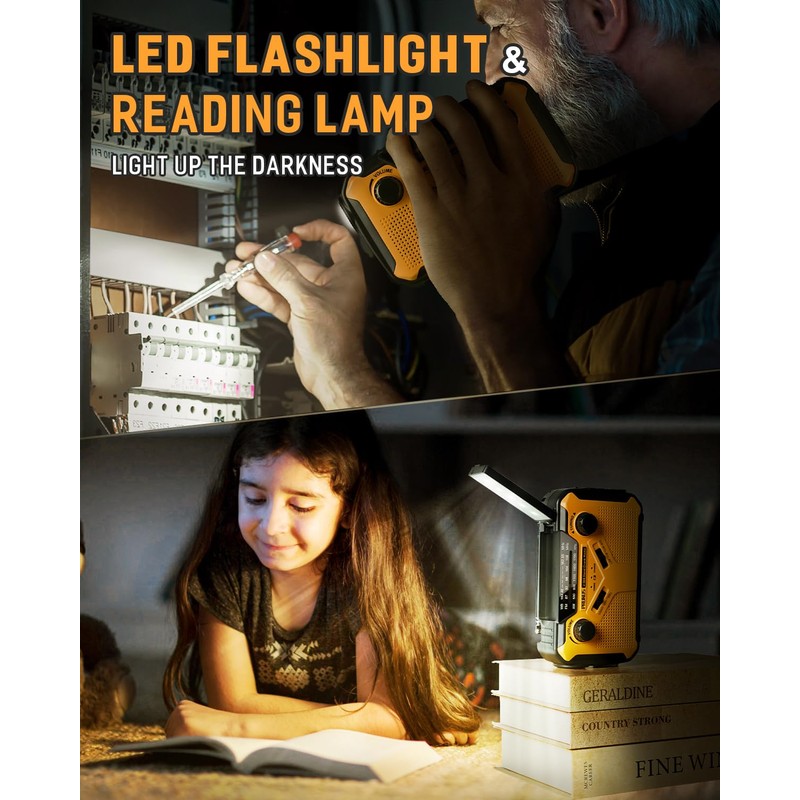 - ??LED Flashlight & Reading Lamp: This hand crank radio with its flashlight and reading lamp is a must-have for all you outdoor junkies and folks who find themselves walking in the dark during blackouts. The LED flashlight is bright enough to light up your path, so you won't trip over every twig and stone when nature calls in the middle of the night. Pop out that solar panel, you've got a reading lamp that covers a bigger area.