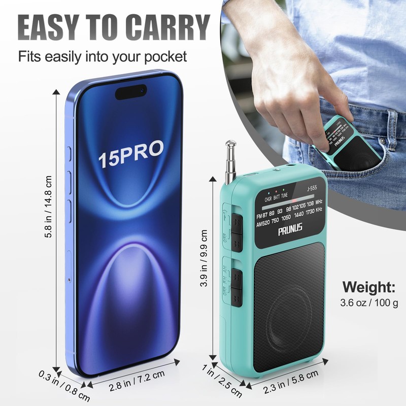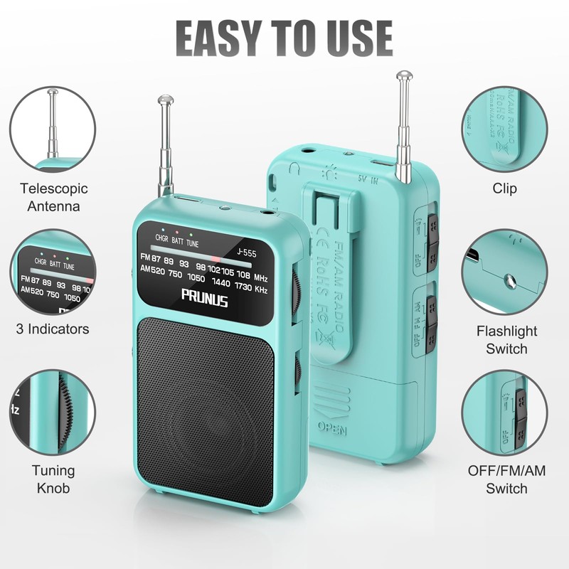 PRUNUS J-555 Pocket Radio AM FM USB-C Charging& Battery Operated, Excellent Reception& Clear Speaker and Headphone Jack, Back Clip, Flashlight, Transistor Radios, Portable Radios AM FM, Mini Radio