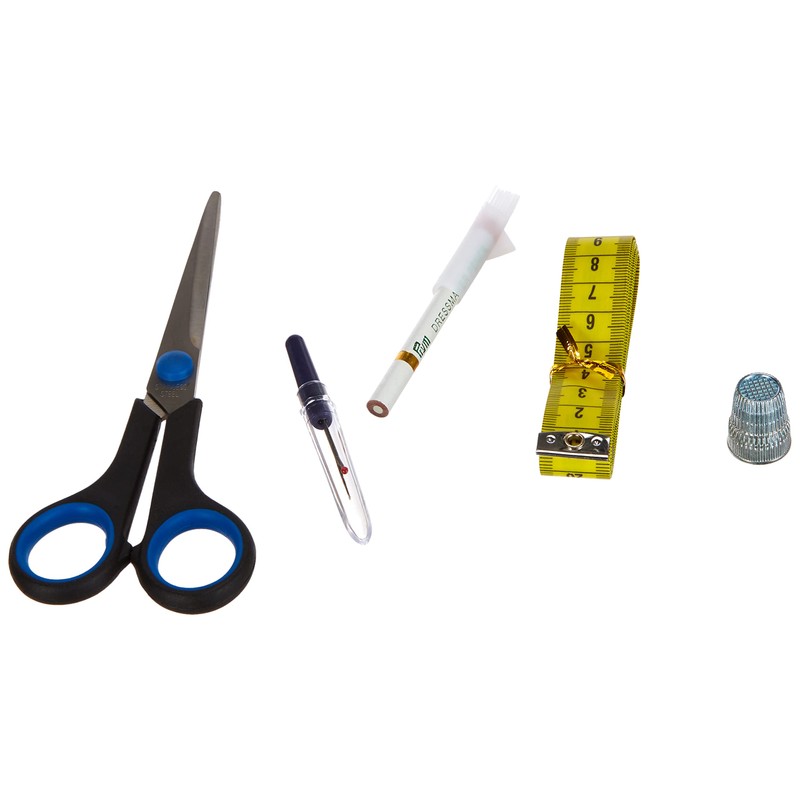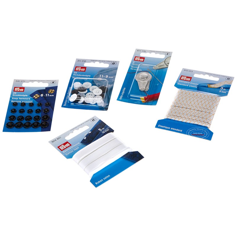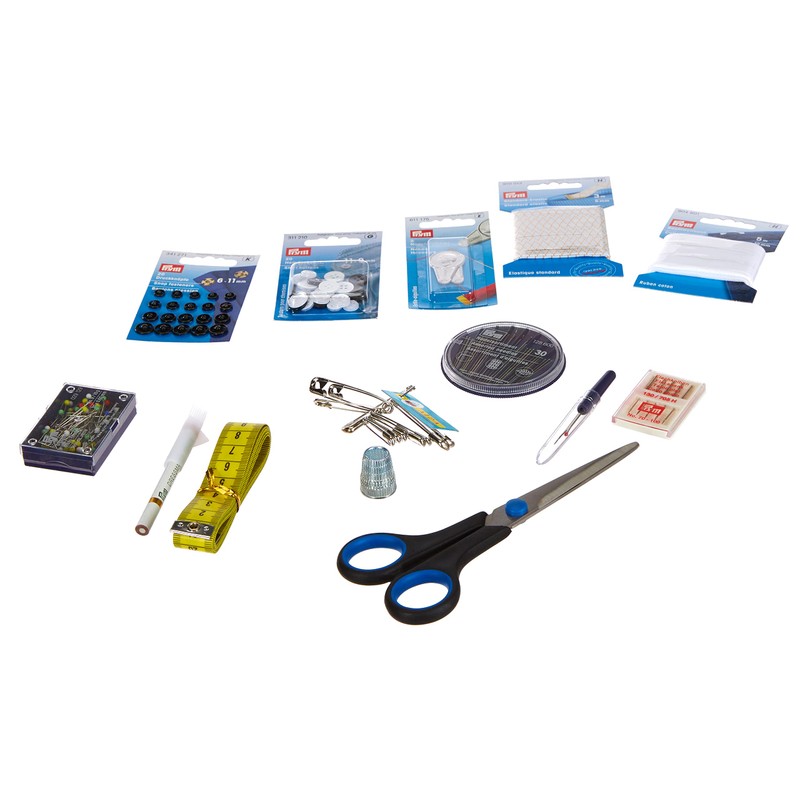 - Content: pins, safety needles, sewing/embroidery/darning needles, sewing machine needles, measuring tape, sew-on poppers,