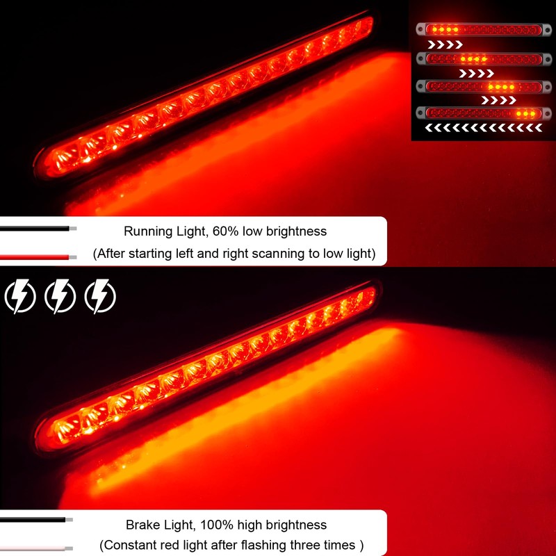 - 🚥【Newly Upgraded Taillight】 Two red lighting functions: ①Running light is 60% low brightness(after starting flow water scanning to low light). ②Brake Light is 100% high brightness (constant red light after blasting flash). It is eye-catching enough to remind vehicles behind to keep their distance and ensure safety.