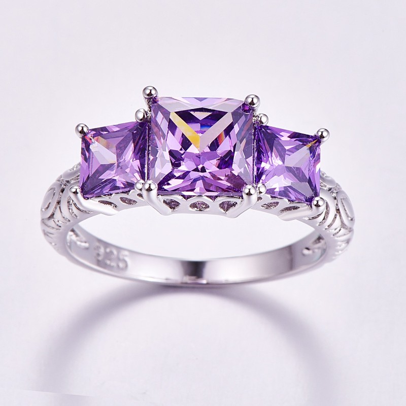 Psiroy 925 Sterling Silver Plated Princess Cut Simulated Amethyst 3 Stones Engagement Ring for Women Size 9