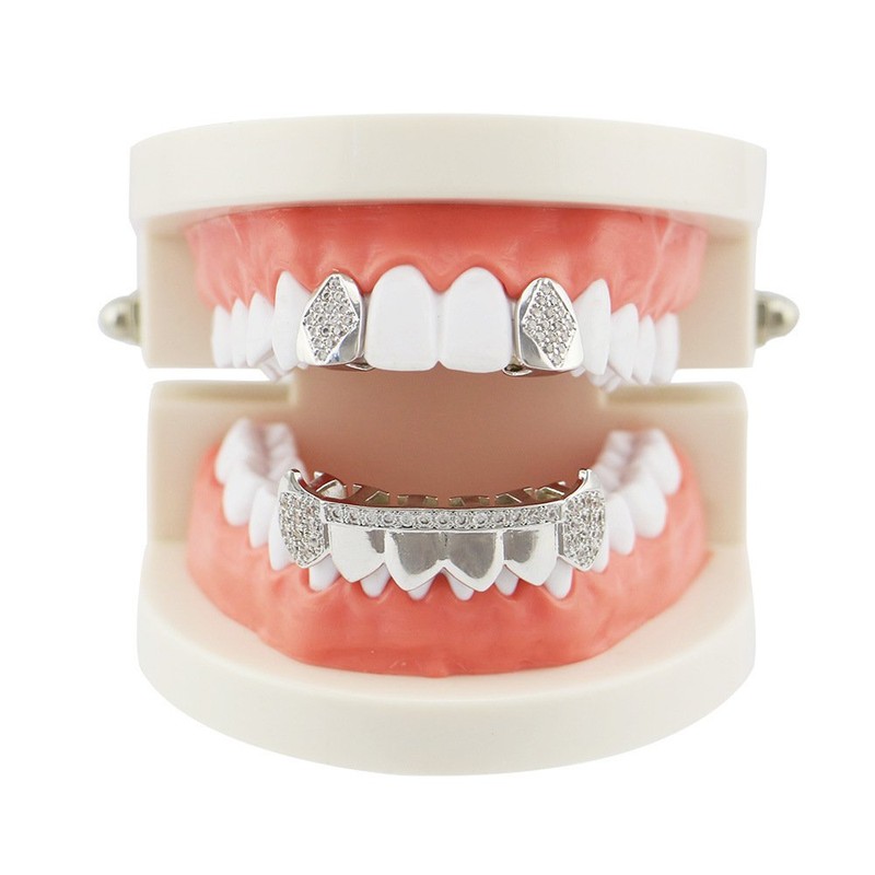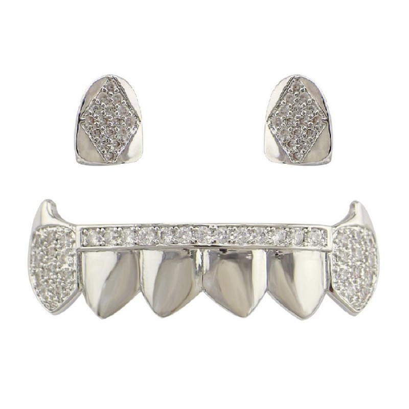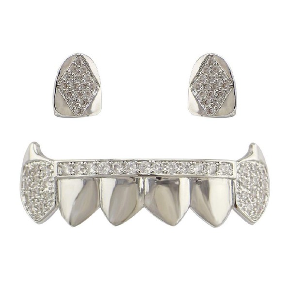 Psivika Gold Plated Shiny Hip Hop Teeth Grillz Caps Vampire Fangs Grillz with Diamonds for Your Teeth for Men and Women, 2 PCS Single Top 6 Bottom (Silvery)