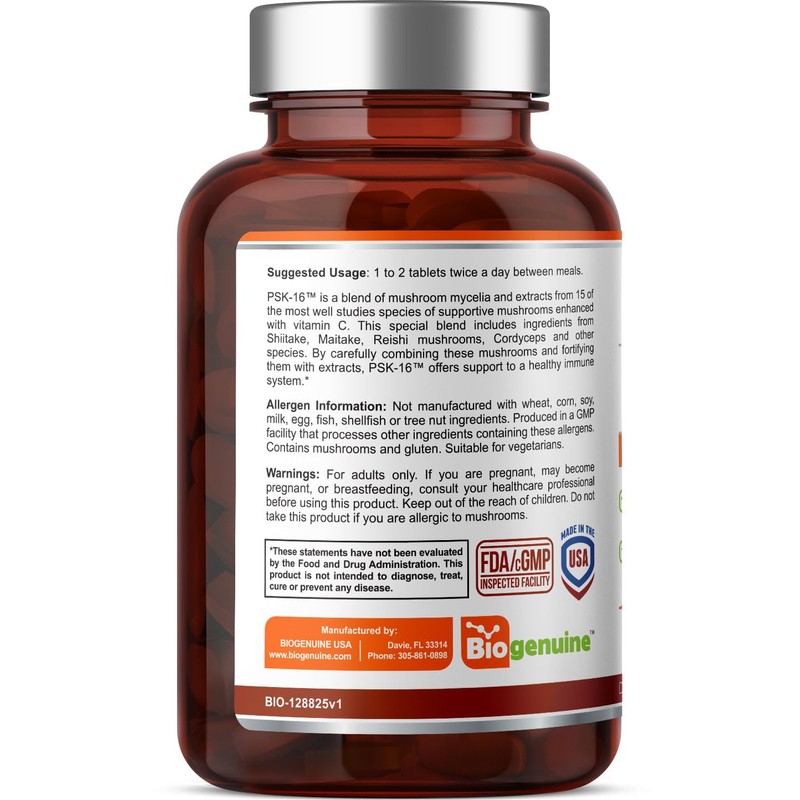 - POWERFUL IMMUNE SUPPORT: PSK-16 is our natural mushroom blend, containing Vitamin C, and extracts and mycelia from 15 carefully selected medicinal mushrooms. It is specially formulated to support normal NK cell and T-cell activity, and healthy cytokine production. Each tablet contains 1070 mg of our proprietary blend, making it stronger and more effective than most mushroom mycelia blends on the market.