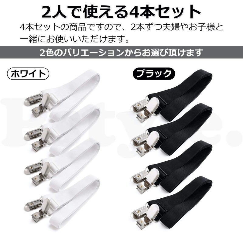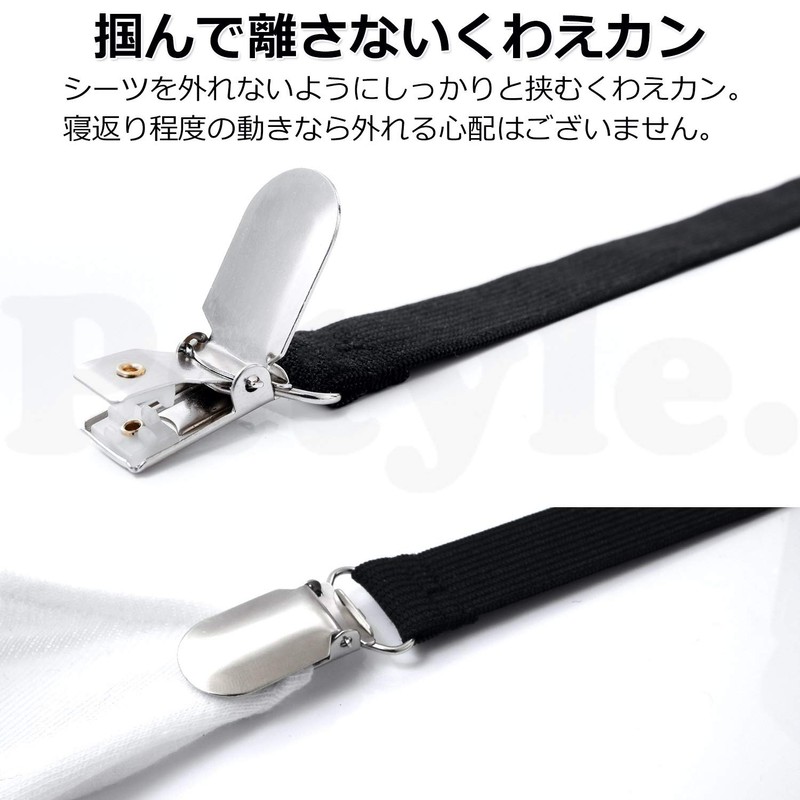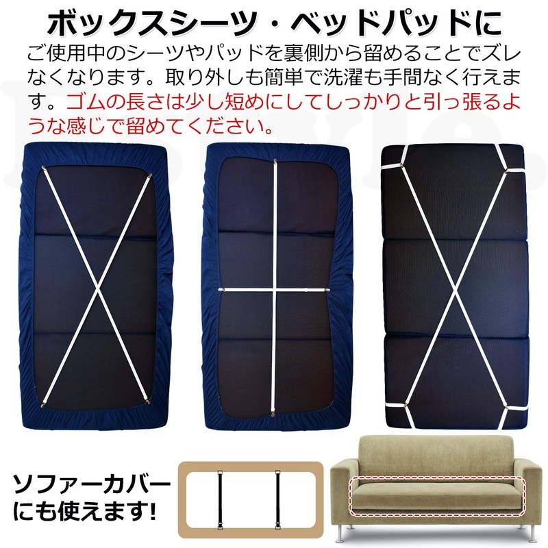 - 【For Fitted Sheets and Bed Pads】 Secure your sheets, pads, sofa covers, etc. from the back to prevent slipping. Easy to remove and wash without hassle. *The length of the elastic band should be slightly shorter and fastened to the feeling of pulling tightly