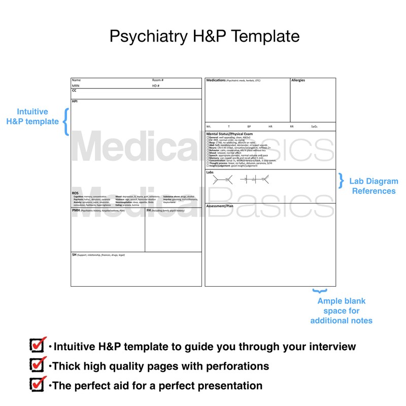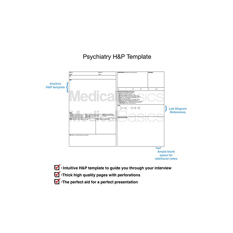 - 100 complete Psychiatry H&P templates. Each notebook comes with 1 reference sheet for Psychiatry. Optimized to have all the fields that you need and nothing else.