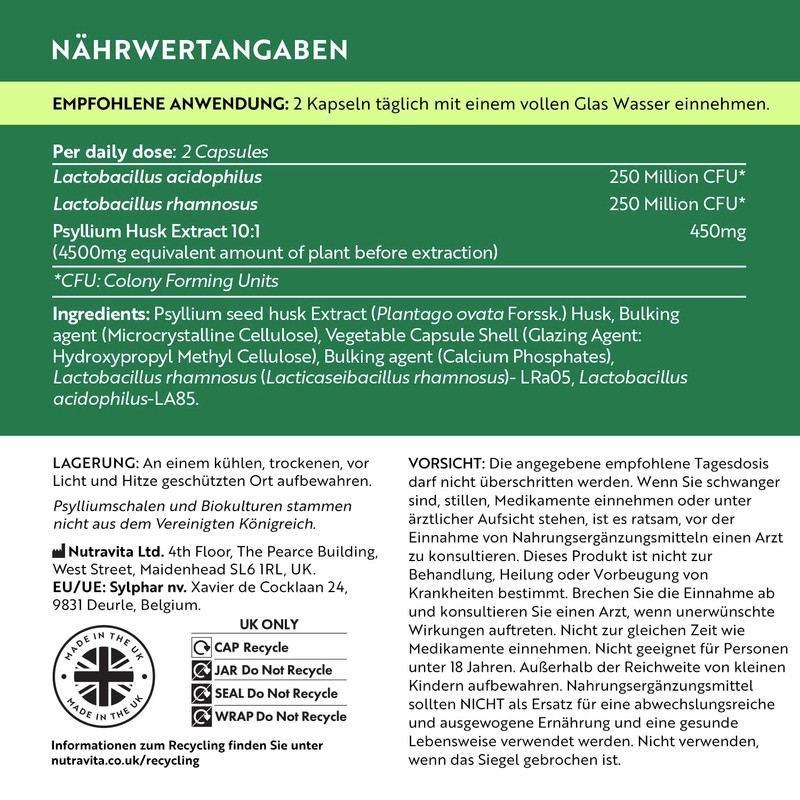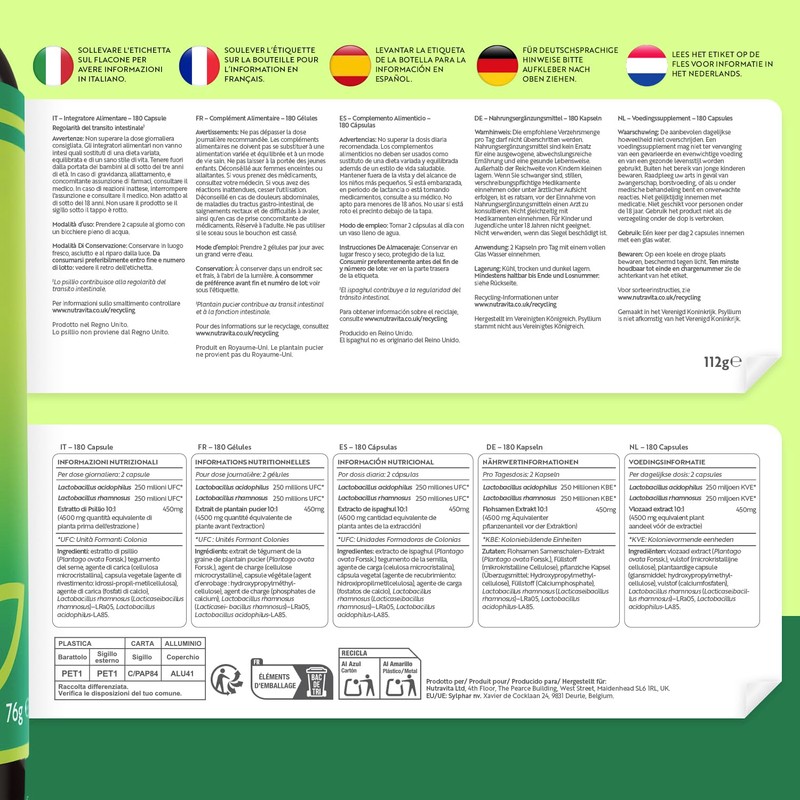 - Psyllium husks + organic cultures - 180 vegan capsules - Nutravita