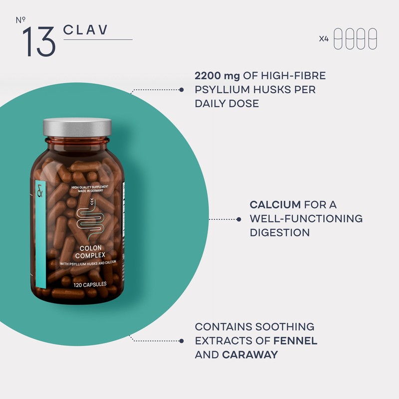 At CLAV, we've passionately taken on the challenge of creating an optimally balanced formula for digestion. The result is our new N°13 Colon Complex, a unique blend of natural ingredients, intelligently selected and combined to boost your digestion and gently support your well-being. Our meticulously formulated fiber supplement capsules combine the benefits of psyllium husk, calcium, fennel, and caraway extracts into a comprehensive solution for a happy gut and balanced digestion.