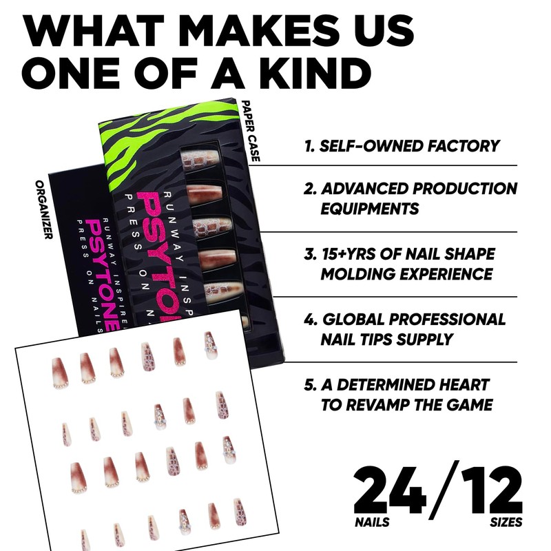 • đź’…A Revolution in Nail Fashion: The world’s first runway inspired press on nails, our innovative and unique design has created a wave of fashion in the nail industry compared to the cookie-cutter nail art on the market.