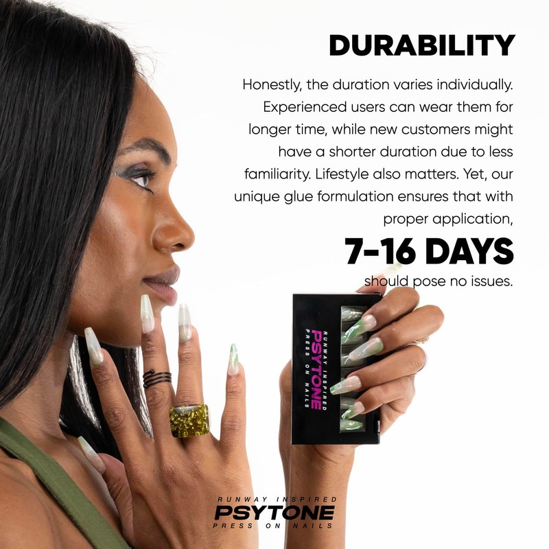 • Exceptional Customer Service: Visit our store and experience the true indulgence of Psytone’s Runway Press On nails. We prioritize customer satisfaction and provide a guarantee of excellent service.