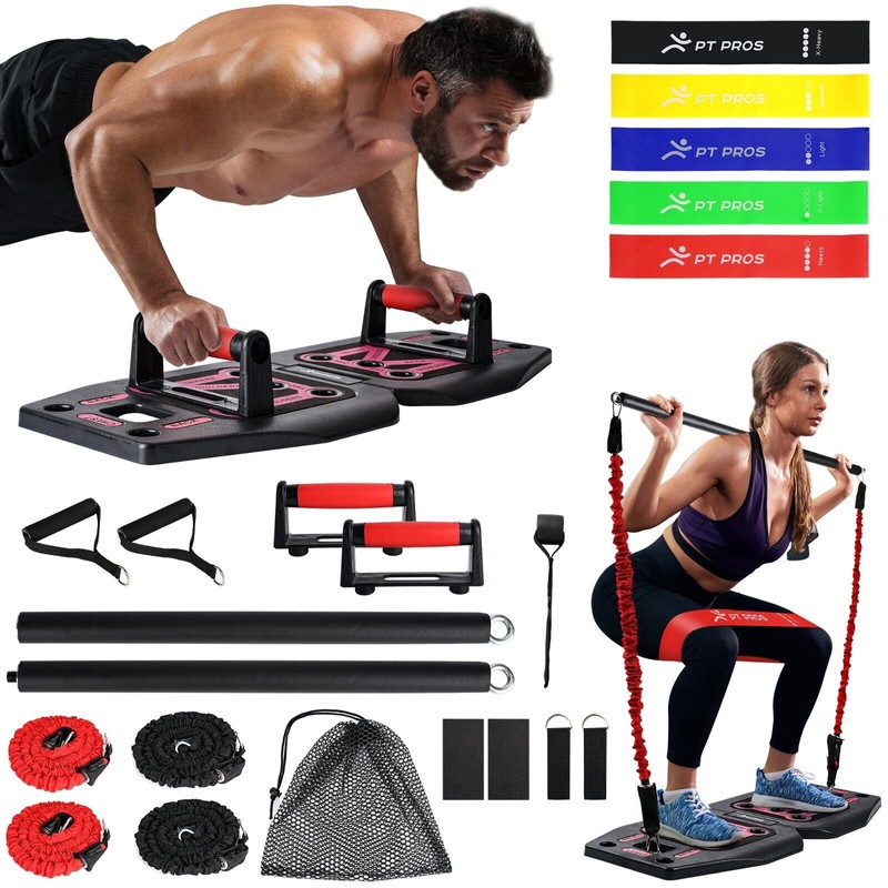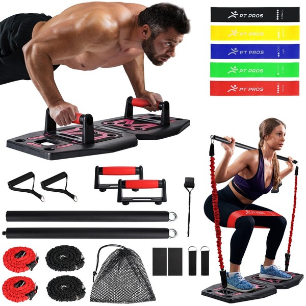 - 👨⚕️ PHYSICAL THERAPIST DESIGNED - Our push-up board has been designed for easy yet safe and effective home workouts. We've simplified the board with only the most important push-up variation position to help target different muscle groups. We've also added additional exercise equipment so you will be able to get a complete workout. The extra fitness accessories include the mini-loop resistance band set and resistance bands with a long bar for better functional workouts.