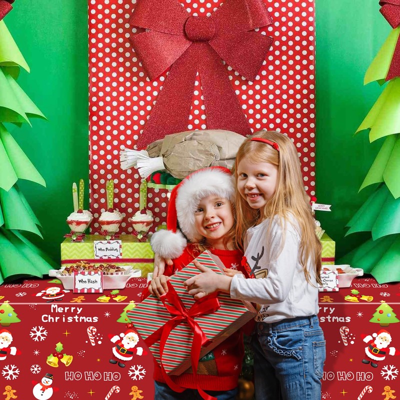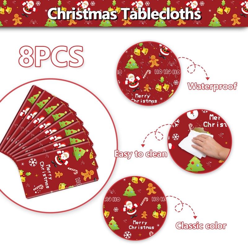 - Classic Christmas Decorations: Our Christmas party tablecloths contain Santa Claus, Christmas snowmen, Christmas trees, snowflakes and other Christmas elements.red table cloth making your Christmas time more festive and memorable