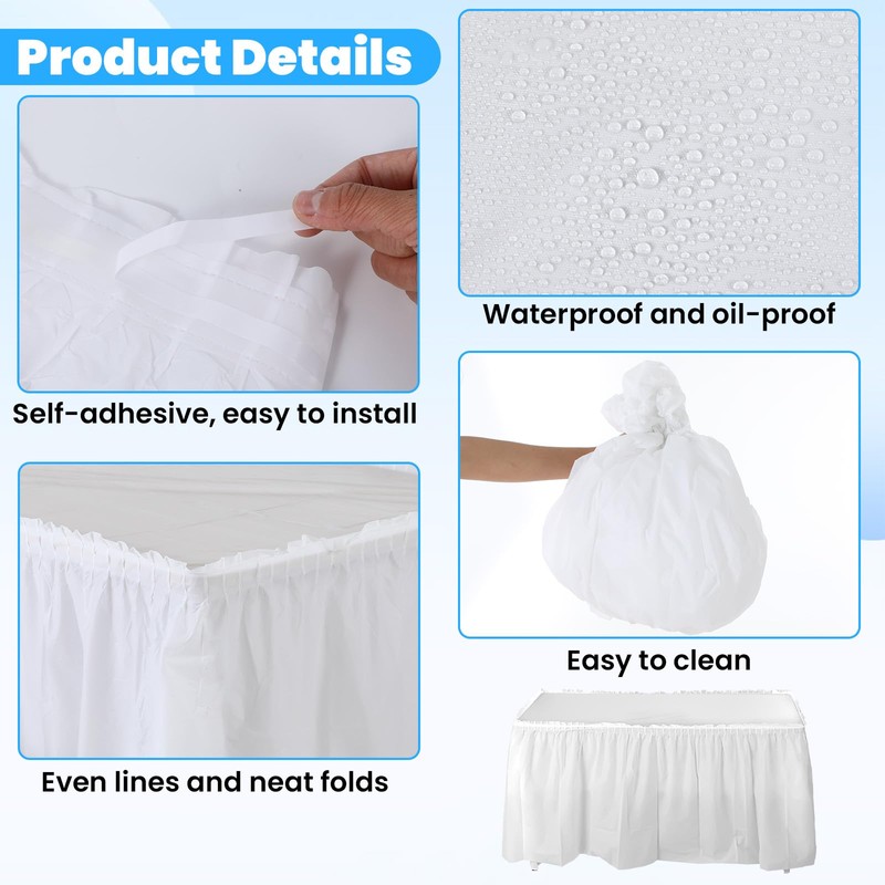 Function: 3 white tablecloths and 3 table skirts, suitable for most rectangular tables on the market; the plastic table skirt has double-sided tape inside the skirt, which is convenient for tearing off and using