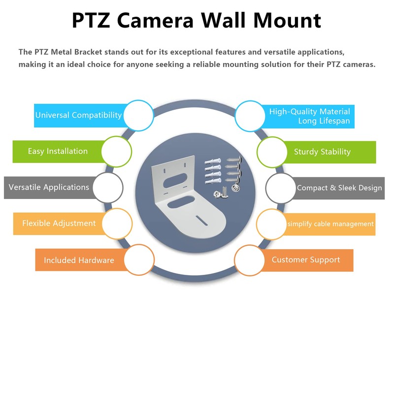 - Universal Compatibility: Compatible with all PTZ cameras, including Prisual, SDI, HDMI, USB, and IP cameras. This eliminates the need to purchase multiple brackets for different brands, saving time and money.