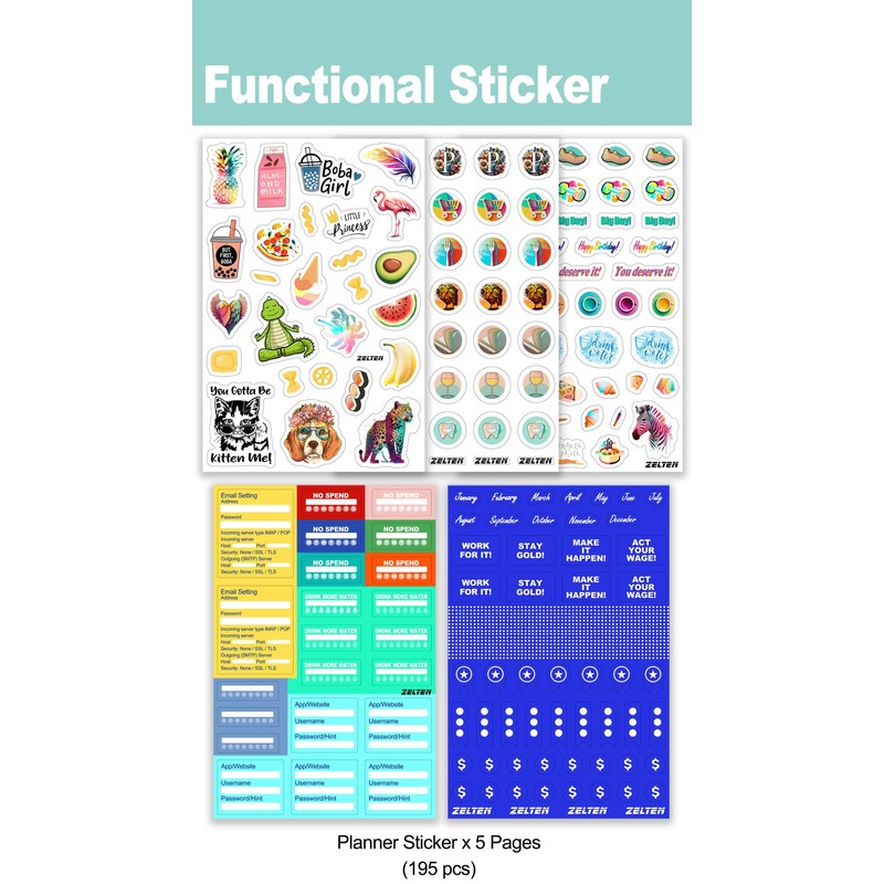 - Gift box includes: 1 A5 premium PU leather binder, 13 sheets monthly planner, 54 sheets weekly planner,5 pages functional sticker (195pcs), 1ruler, 1 black ball pen, 160pcs highlight tab, 1 gift box