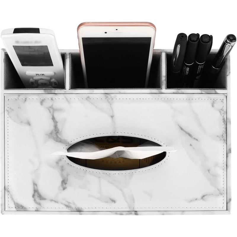 - Multifunctional design: This desk storage box is a combination of tissue box and remote control storage box. You can store your tissues in the large box and the other three divided smaller box can help you store your remote controls, pens, smartphone, scissors and torch. Spend less time looking for what you need, and more time focusing on what matters.
