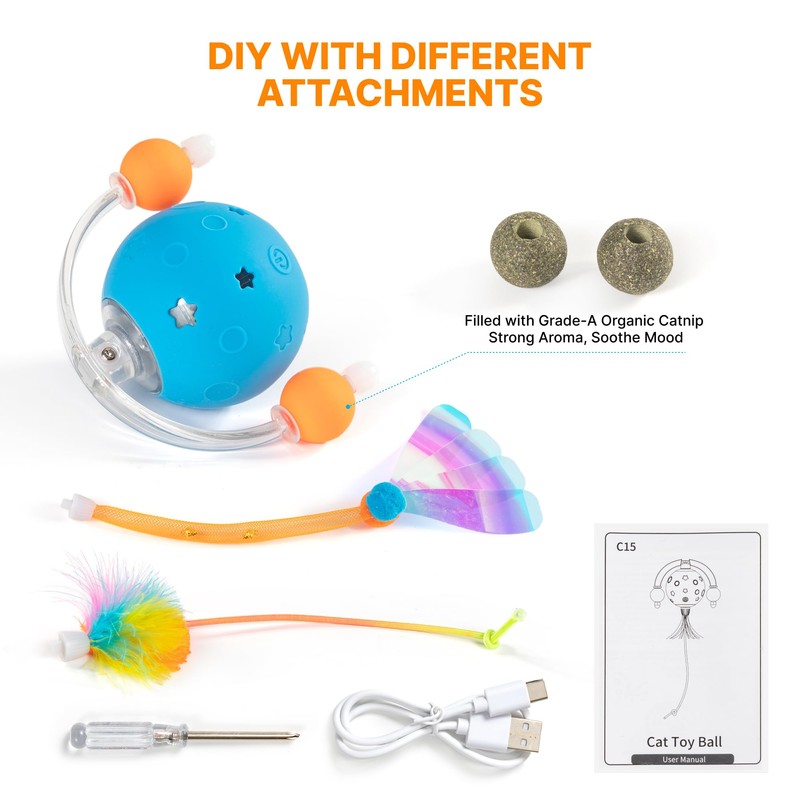 - CATNIP & VARIETY ACCESSORIES This movable cat toy is designed to delight your cat with various exciting features. The additional catnip accessories arouse interest and provide endless fun. A built-in bell attracts your cat's attention and promotes active interaction, while the feather attachment provides additional stimuli that satisfy the natural hunting instinct and drive away boredom