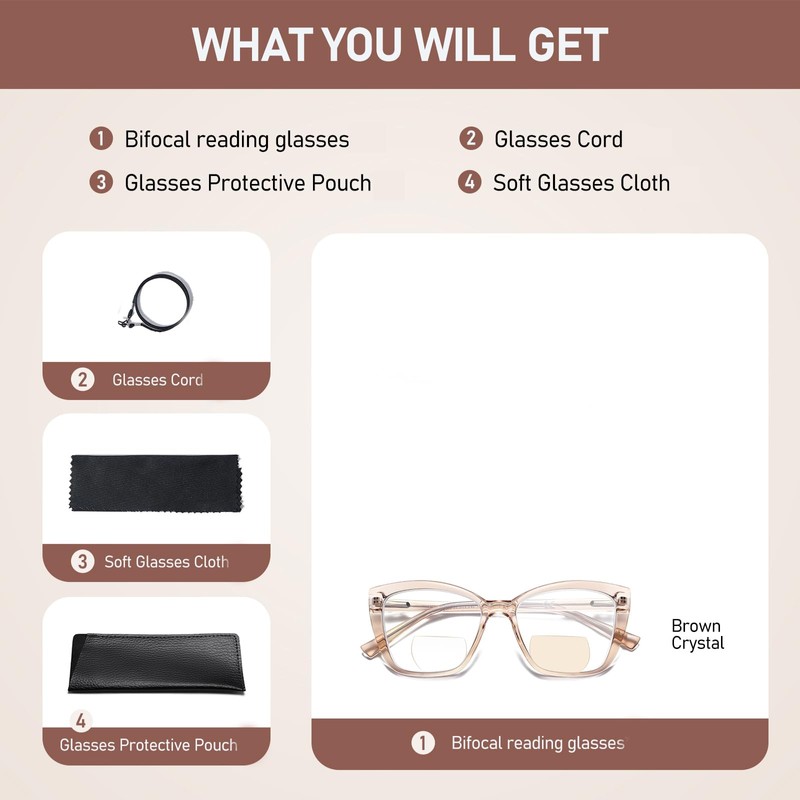 - 1 PCS BIFOCAL READER:1-pack oversized cat-eye bifocal readers in champagne. Stylish, comfy, and perfect for any face shape. Enjoy clear vision and all-day reading protection with these trendy, full-rim bifocal glasses.