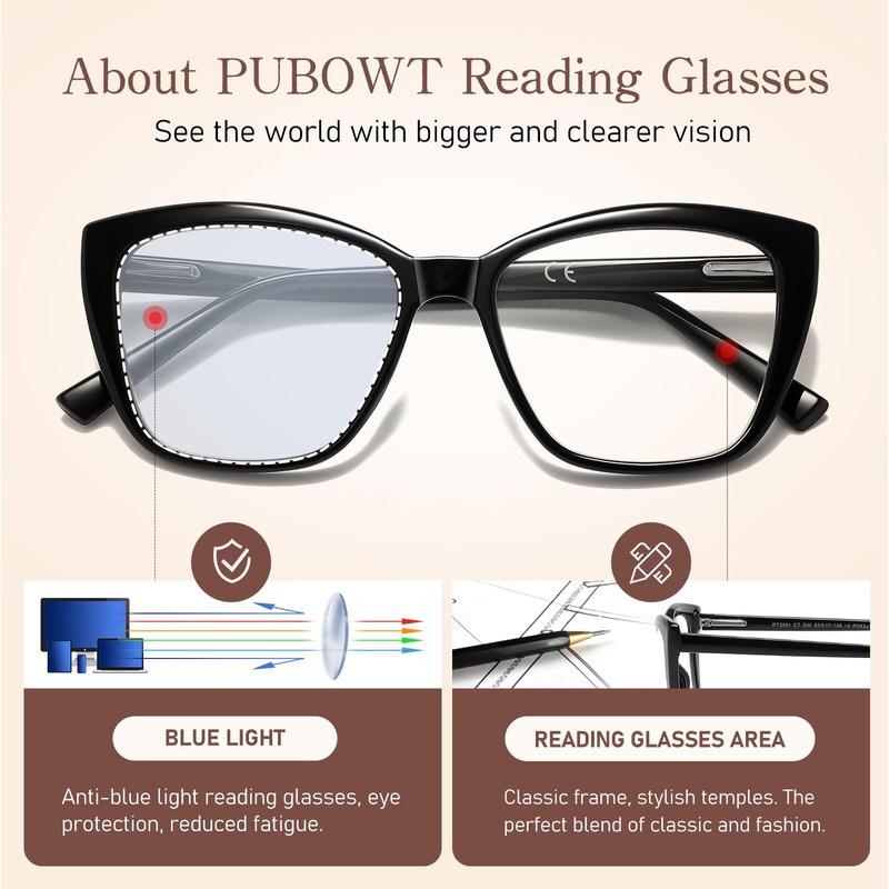 - BLUE LIGHT BLOCKING & UV PROTECTION: PUBOWT scratch resistant anti-reflective blue blocker cat eye reading glasses with UV400 protection, effectively resist harmful blue rays. Professional and accurate degree configuration with an HD transparent polycarbonate lens gives you a clear vision. PUBOWT anti bluelight blocking computer reading glasses provide all-day protection. No worry about blurred vision and headache, you can enjoy better sleep and relieve digital eye strain.