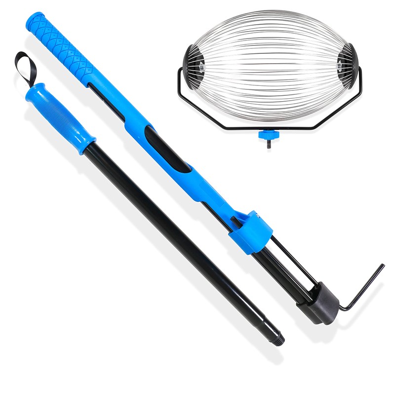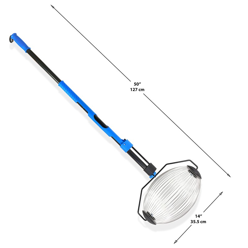 • This durable gatherer has a TPR strength retractable handle which opens the 430 stainless steel wire head. The black and blue pole is made of high strength aluminum/steel alloy.
