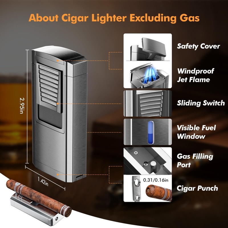 - 【Multi-Functional Cigar Lighter】The windproof cigar lighter features a flame adjuster at the base, offering three powerful jet flames to suit different lighting needs. A visible fuel window on the side makes it easy to check fuel levels and refill gas as needed (gas not included in the original packaging). Additionally, it doubles as a multi-functional cigar punch cutter and cigar holder.