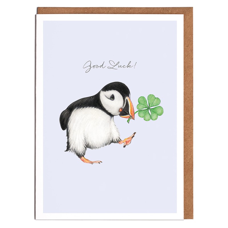 - Featuring a puffin and four leaf clover, designed by London based illustrator Lottie Murphy. Perfect for wishing him or her good luck